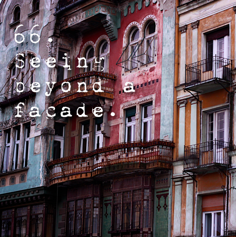 These buildings are in Timisoara, Romania….where communist dictator Nicolae Ceaucescu decided that he would paint the buildings in bright colored paints, making them look like rich, well kept buildings & in turn a great city/country…..what he neglected was under the paint were buildings that were falling apart, housing people who were barely surviving themselves. Now, 20 years later the facade has been exposed.