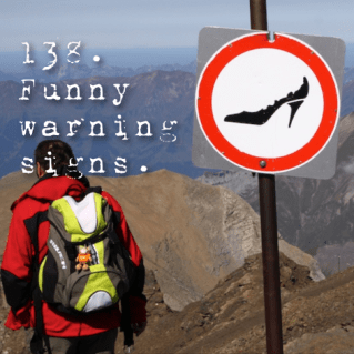 Giving Thanks #138 October 31, 2012January 20, 2015 This sign was at the top of a mountain over 9k feet up……my only question, is what dumb person wore heels up here, to warrant them putting up the sign? Dumb….and funny. Related
